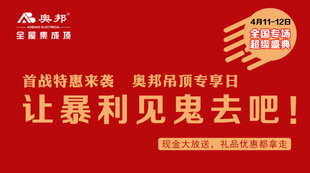 新裝品質,精彩不斷。品質奧邦,全心為你。四月中旬奧邦吊頂專享日,奧邦總部聯合全國經銷商,特惠全國消費者,為您的溫馨家居添一份驚喜。